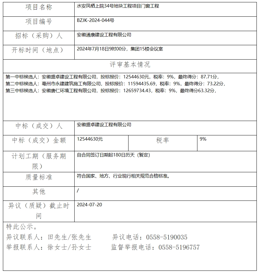 水安鳳棲上院34號(hào)地塊工程項(xiàng)目門窗工程中標(biāo)(成交)結(jié)果公示