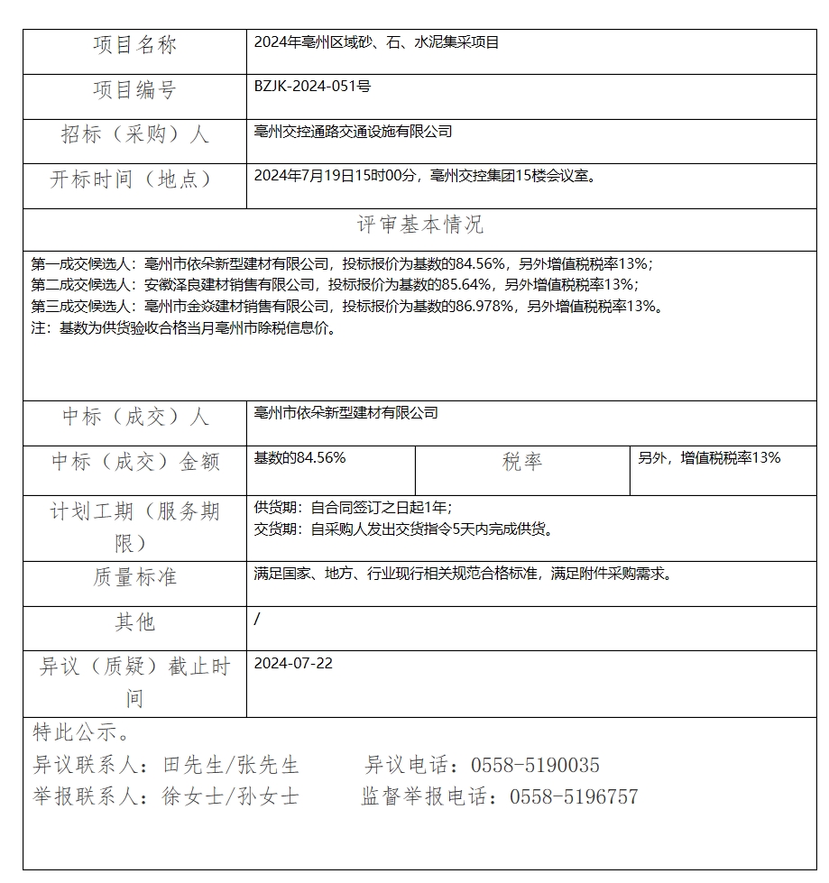 2024年亳州區(qū)域砂、石、水泥集采項目中標(biāo)(成交)結(jié)果公示