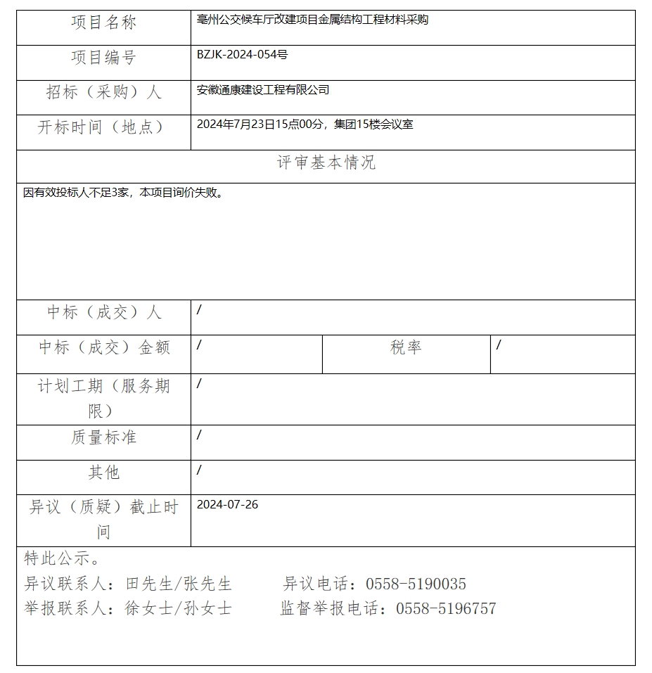 亳州公交候車廳改建項(xiàng)目金屬結(jié)構(gòu)工程材料采購(gòu)中標(biāo)(成交)結(jié)果公示