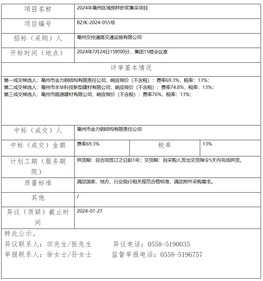 2024年亳州區(qū)域預(yù)拌砂漿集采項目中標(biāo)(成交)結(jié)果公示