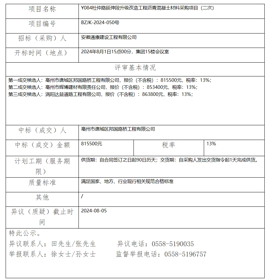 Y084杜仲路延伸段升級改造工程瀝青混凝土材料采購項(xiàng)目(二次)中標(biāo)(成交)結(jié)果公示