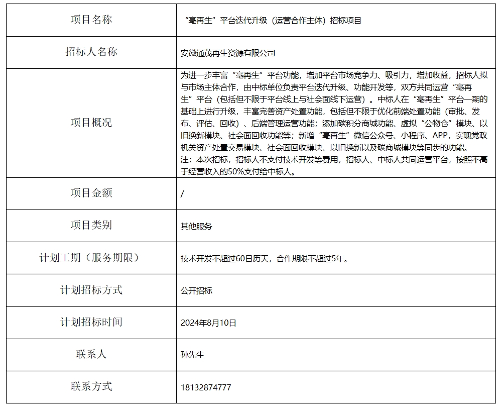 “亳再生”平臺(tái)迭代升級(jí)(運(yùn)營(yíng)合作主體)項(xiàng)目招標(biāo)計(jì)劃
