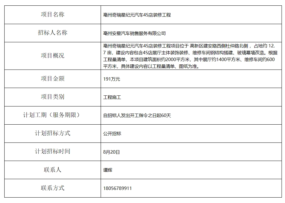 亳州奇瑞星紀(jì)元汽車4S店裝修工程招標(biāo)計(jì)劃
