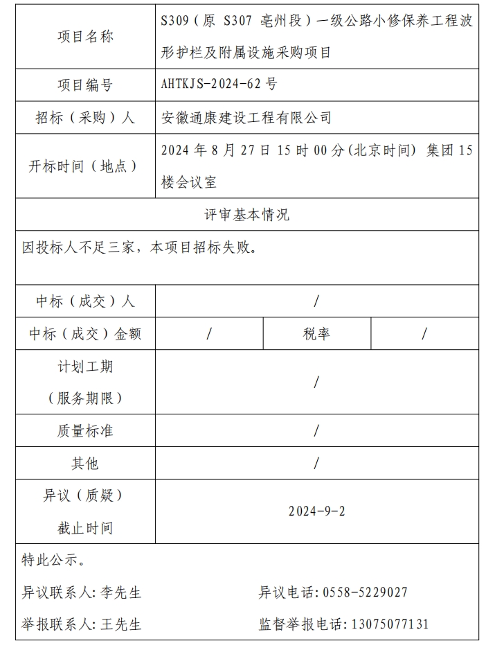 S309(原 S307 亳州段)一級(jí)公路小修保養(yǎng)工程波形護(hù)欄及附屬設(shè)施采購(gòu)項(xiàng)目中標(biāo)(成交)結(jié)果公示