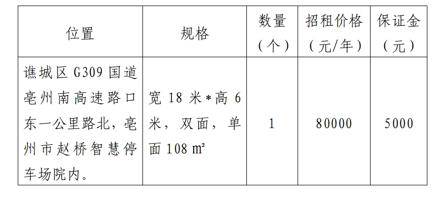 (一)項(xiàng)目概況。亳州建投汽車(chē)運(yùn)輸有限責(zé)任公司擬對(duì)趙橋智慧停車(chē)場(chǎng)高炮廣告廣告位進(jìn)行招租,位置、規(guī)格、面積、具體情況如下表所示: