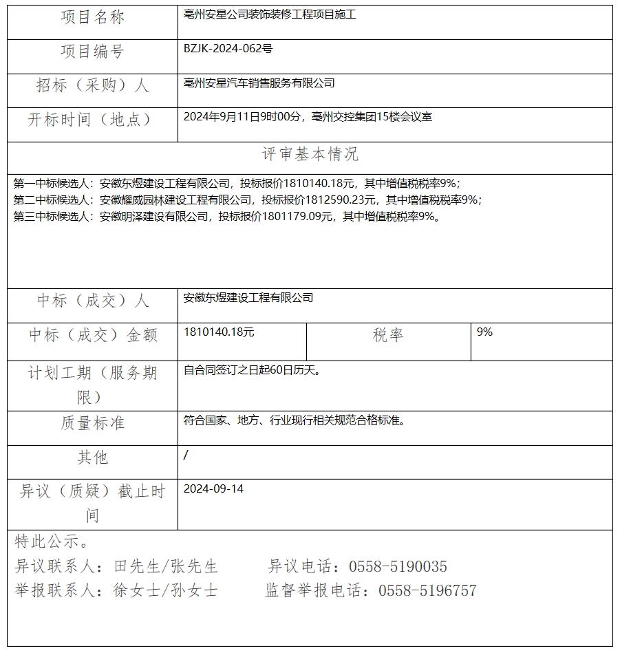 亳州安星公司裝飾裝修工程項目施工中標(biāo)(成交)結(jié)果公示