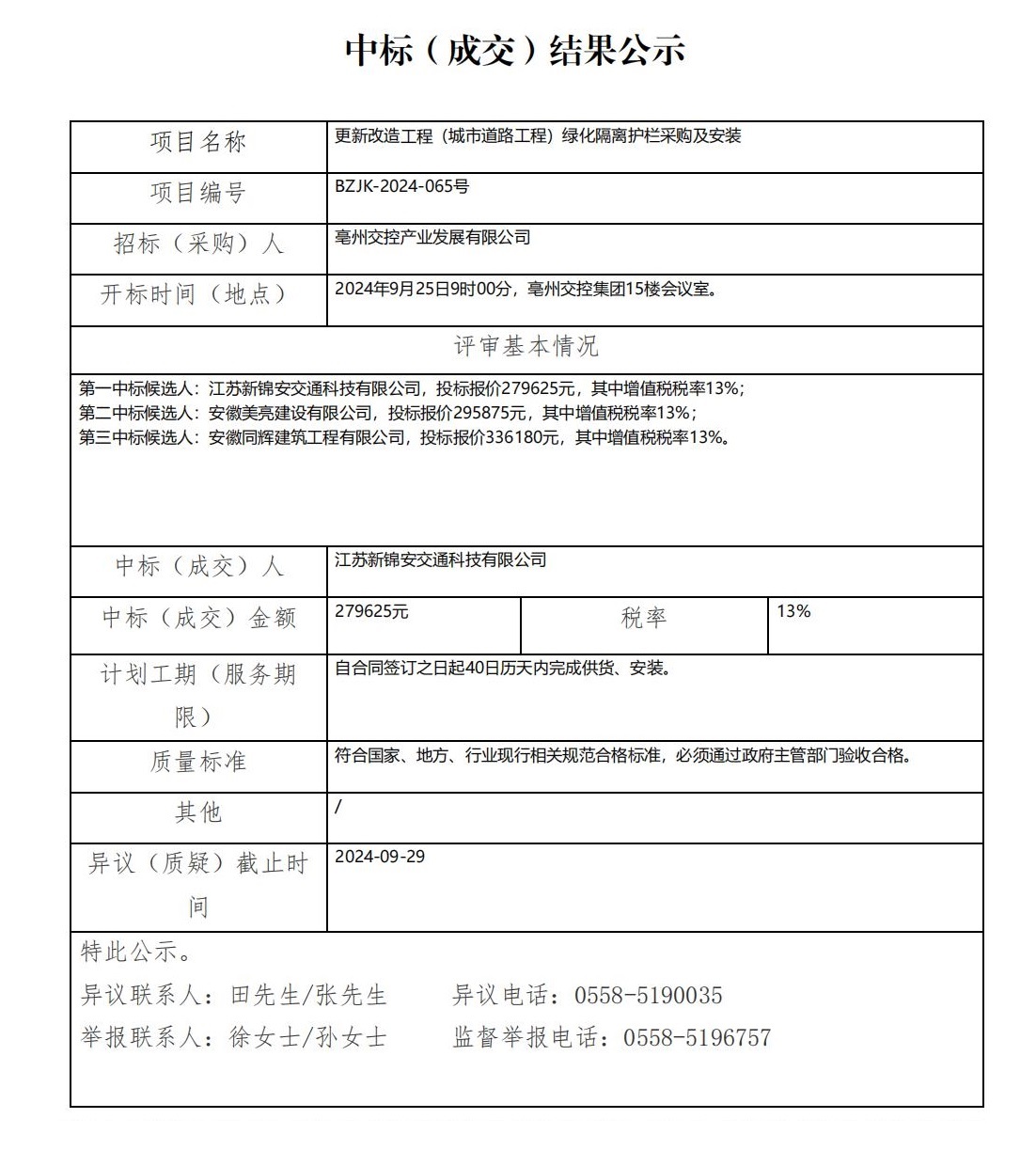 更新改造工程(城市道路工程)綠化隔離護(hù)欄采購及安裝中標(biāo)(成交)結(jié)果公示