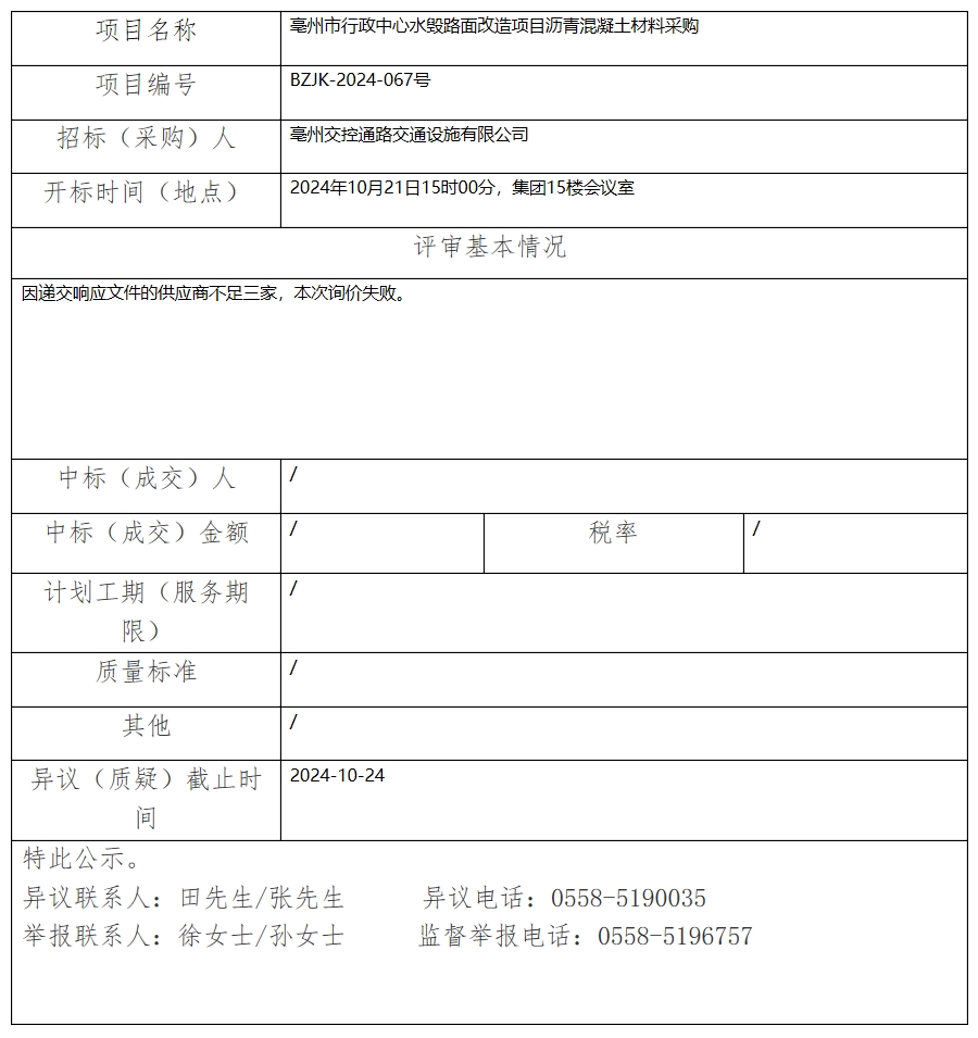 亳州市行政中心水毀路面改造項目瀝青混凝土材料采購中標(biāo)(成交)結(jié)果公示