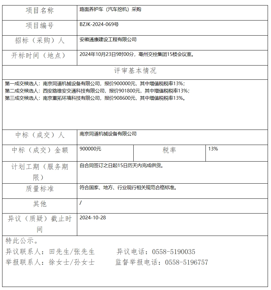 路面養(yǎng)護(hù)車(汽車挖機(jī))采購中標(biāo)(成交)結(jié)果公示