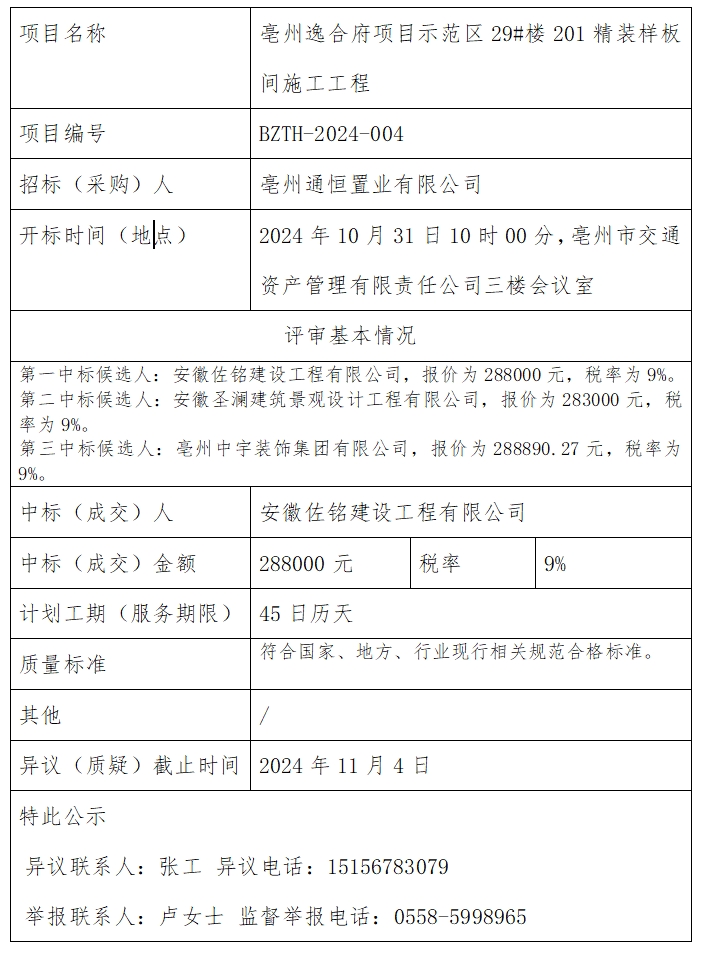 亳州逸合府項目示范區(qū)29#樓201精裝樣板間施工工程中標(biāo)結(jié)果公示