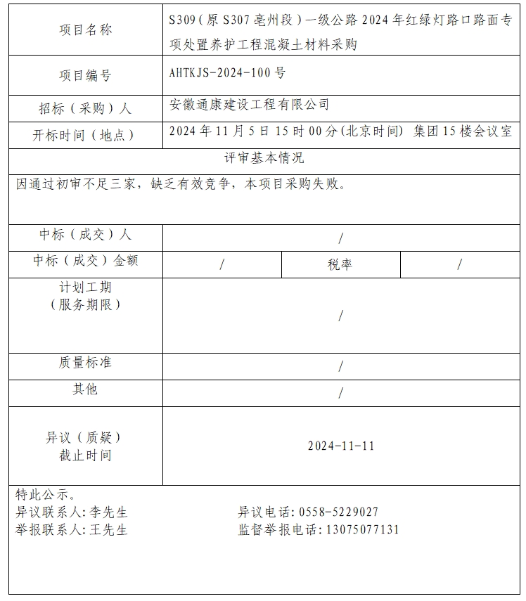 S309(原S307亳州段)一級公路2024年紅綠燈路口路面專項處置養(yǎng)護工程混凝土材料采購中標(成交)結(jié)果公示