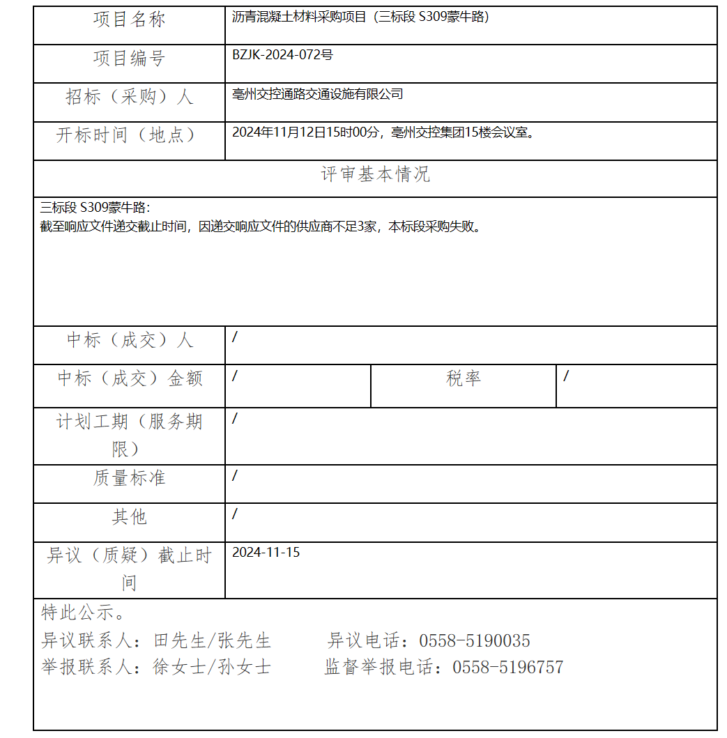 瀝青混凝土材料采購項目(三標段 S309蒙牛路)中標(成交)結(jié)果公示