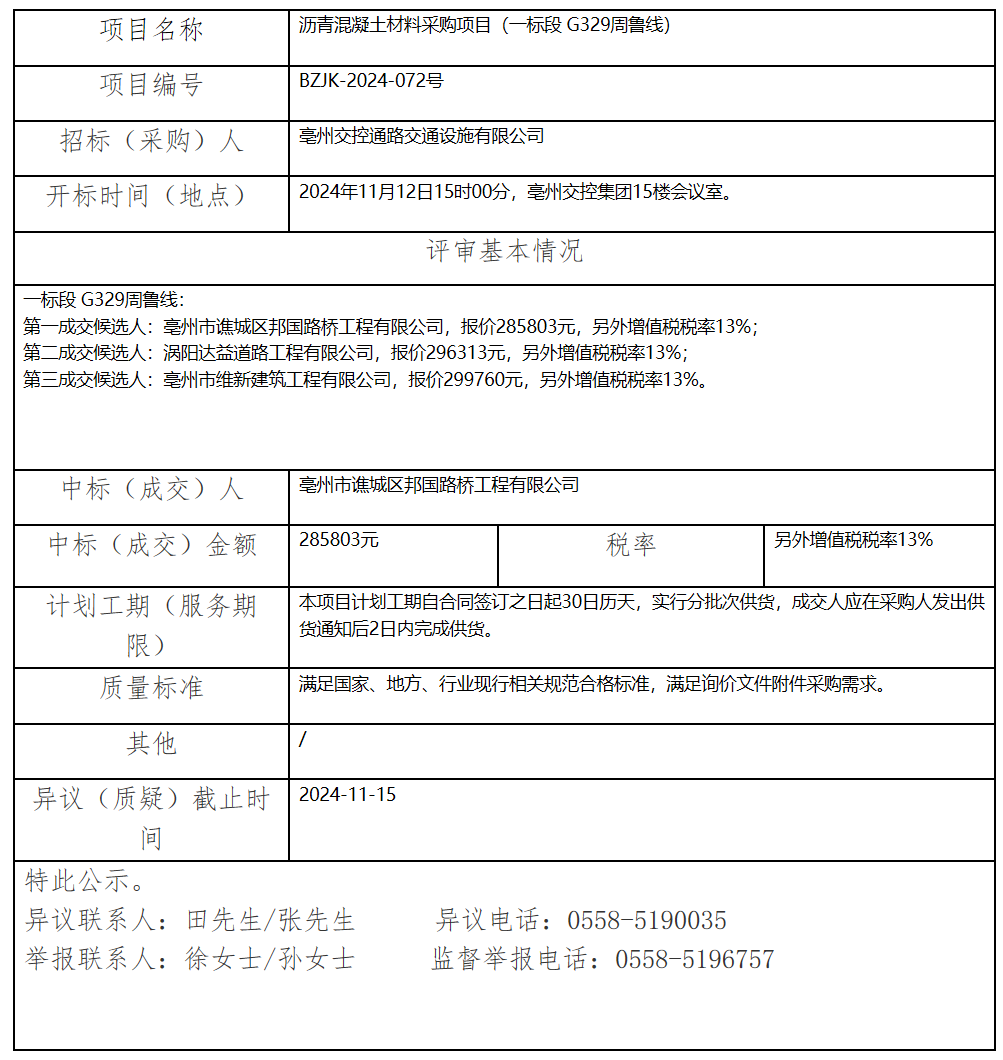 瀝青混凝土材料采購項(xiàng)目(一標(biāo)段 G329周魯線)中標(biāo)(成交)結(jié)果公示