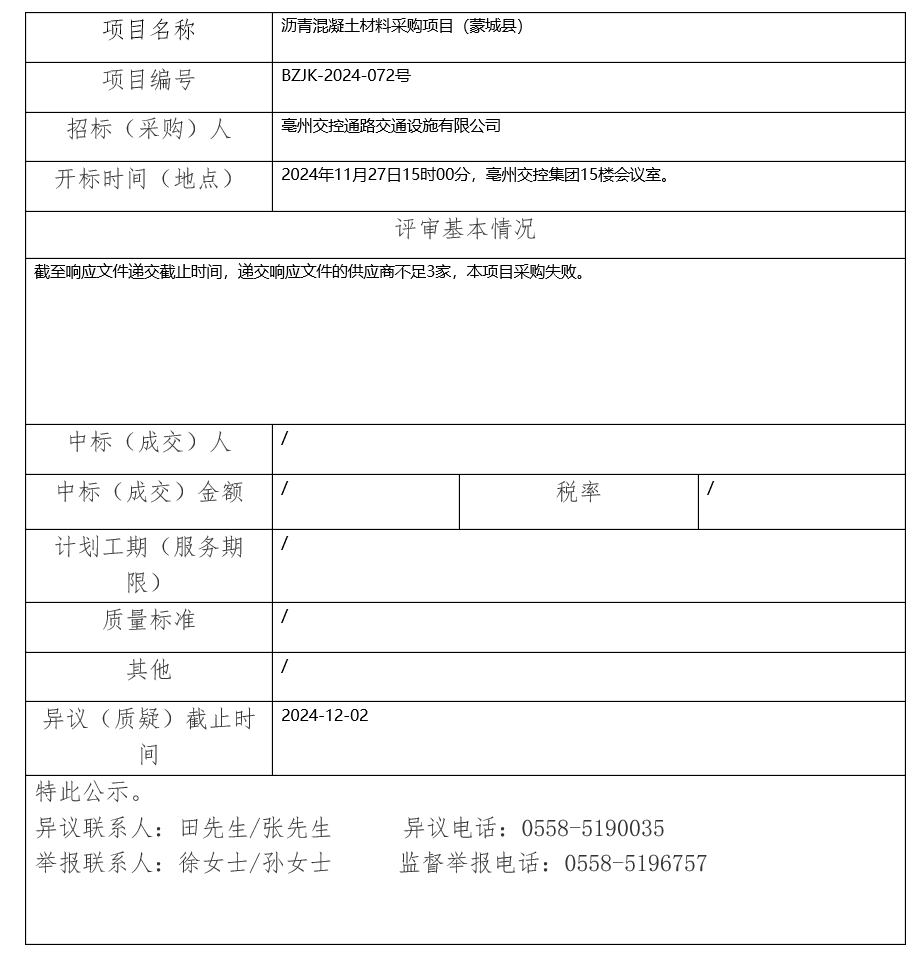 瀝青混凝土材料采購(gòu)項(xiàng)目(蒙城縣)中標(biāo)(成交)結(jié)果公示