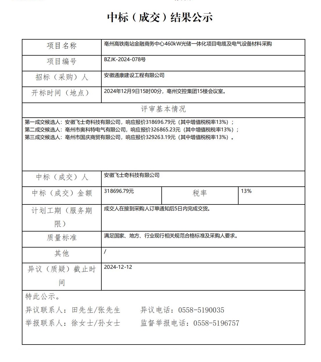 亳州高鐵南站金融商務(wù)中心460kW光儲一體化項目電纜及電氣設(shè)備材料采購中標(biāo)(成交)結(jié)果公示