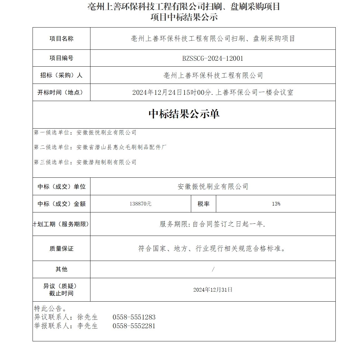亳州上善環(huán)??萍脊こ逃邢薰緬咚?、盤刷采購項(xiàng)目中標(biāo)結(jié)果公示
