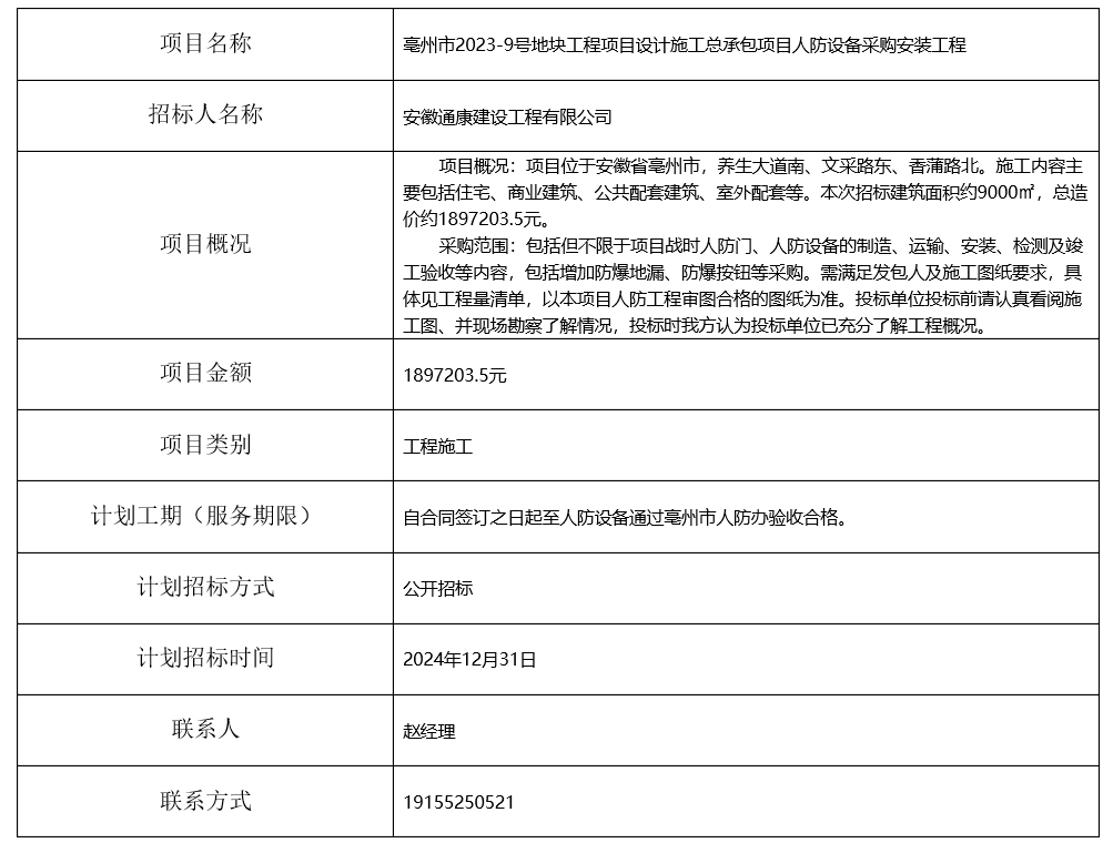 亳州市2023-9號(hào)地塊工程項(xiàng)目設(shè)計(jì)施工總承包項(xiàng)目人防設(shè)備采購(gòu)安裝工程招標(biāo)計(jì)劃