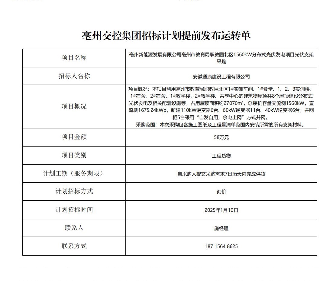 亳州新能源發(fā)展有限公司亳州市教育局職教園北區(qū)1560kW分布式光伏發(fā)電項(xiàng)目光伏支架采購(gòu)招標(biāo)計(jì)劃