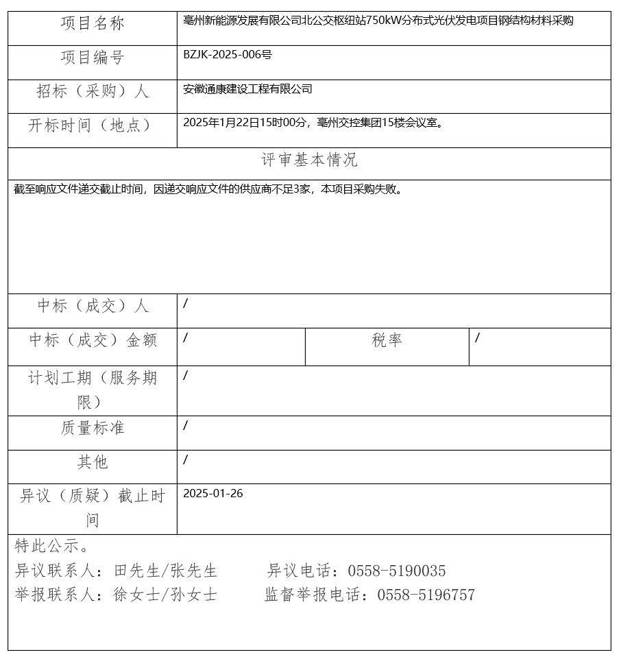 亳州新能源發(fā)展有限公司北公交樞紐站750kW分布式光伏發(fā)電項(xiàng)目鋼結(jié)構(gòu)材料采購(gòu)中標(biāo)(成交)結(jié)果公示