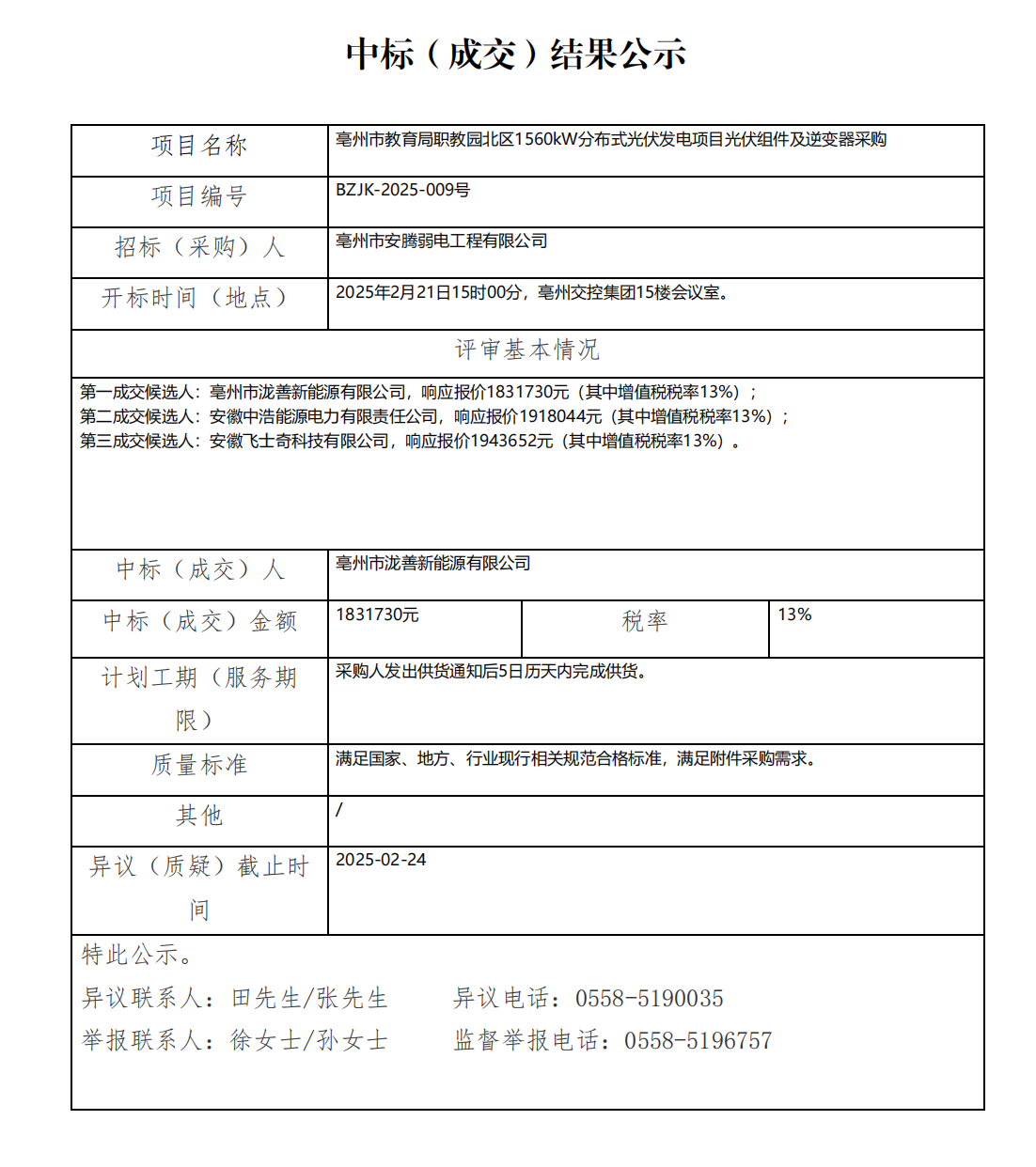 亳州市教育局職教園北區(qū)1560kW分布式光伏發(fā)電項(xiàng)目光伏組件及逆變器采購(gòu)中標(biāo)(成交)結(jié)果公示