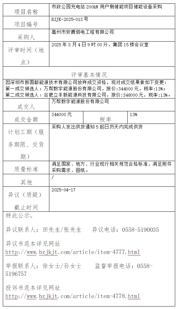 市政公園充電站200kW用戶側(cè)儲(chǔ)能項(xiàng)目?jī)?chǔ)能設(shè)備采購成交結(jié)果變更公示