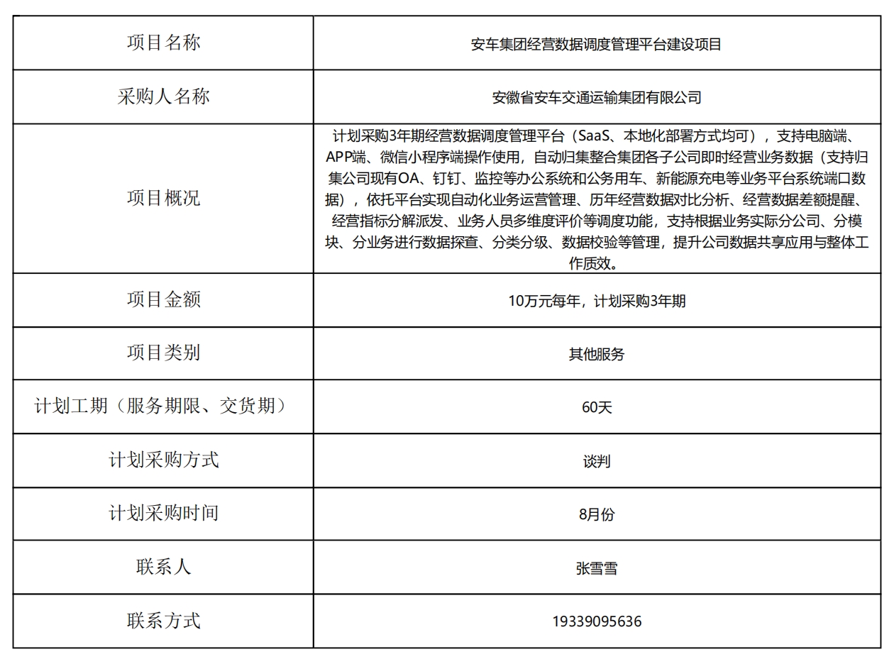 安車集團(tuán)經(jīng)營數(shù)據(jù)調(diào)度管理平臺建設(shè)項目招標(biāo)計劃