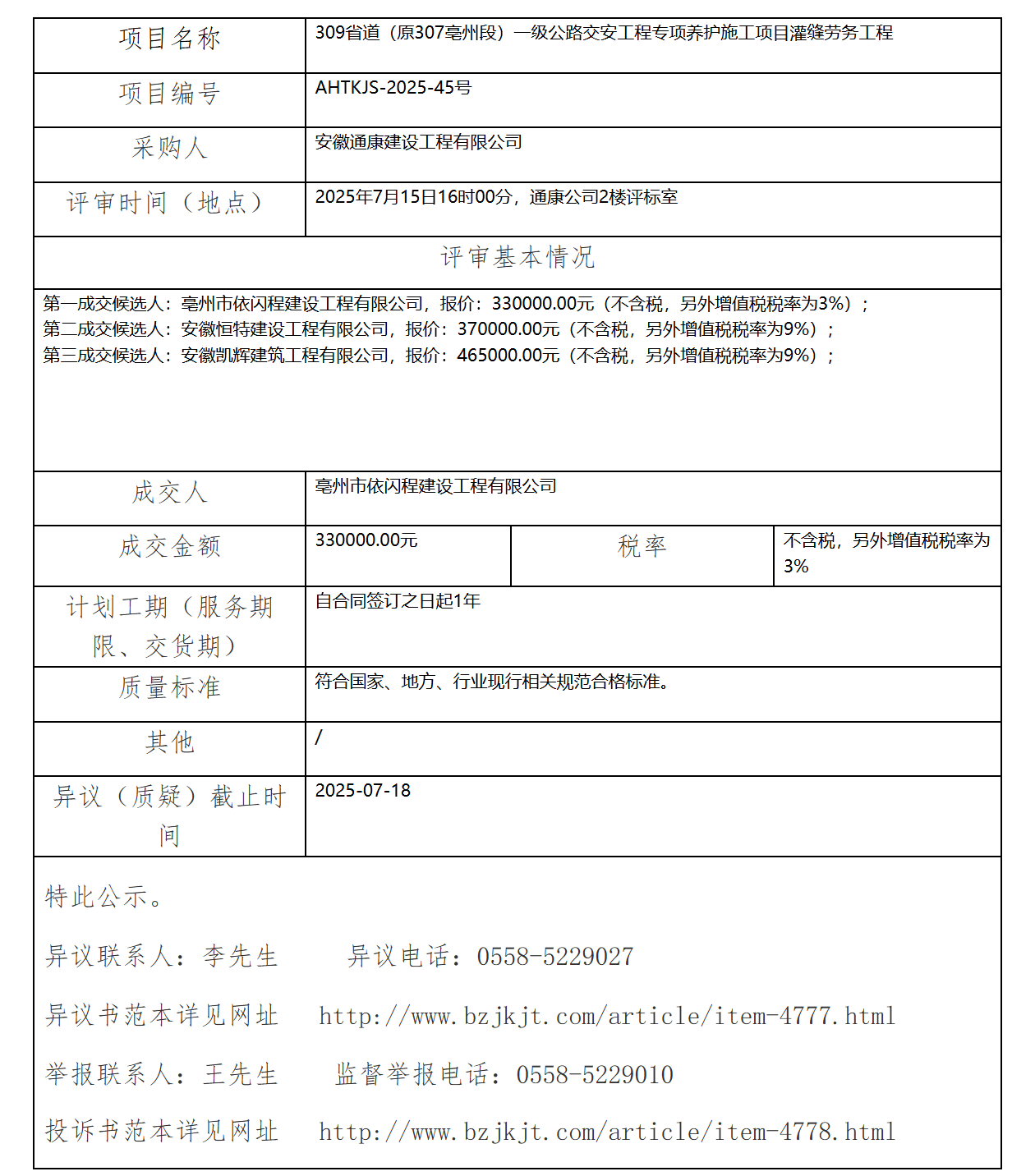 309省道(原307亳州段)一級(jí)公路交安工程專項(xiàng)養(yǎng)護(hù)施工項(xiàng)目灌縫勞務(wù)工程成交結(jié)果公示