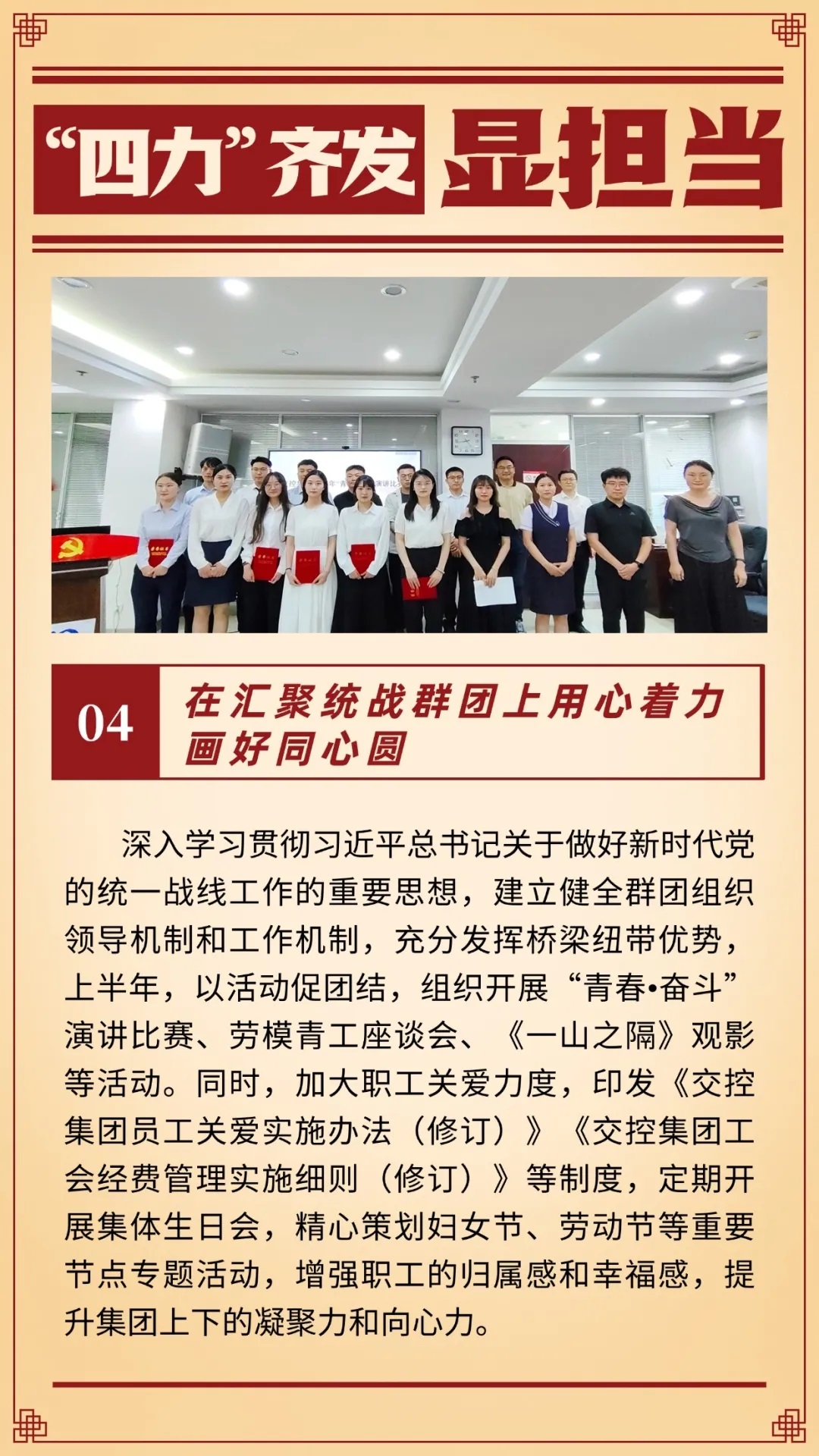 今年以來(lái),交控集團(tuán)黨委堅(jiān)持以習(xí)近平新時(shí)代中國(guó)特色社會(huì)主義思想為指導(dǎo),緊緊圍繞年度發(fā)展目標(biāo),聚焦主責(zé)主業(yè),以提升“四力”為抓手,持續(xù)推動(dòng)黨建工作提質(zhì)增效,為集團(tuán)高質(zhì)量發(fā)展提供堅(jiān)強(qiáng)政治和組織保證。