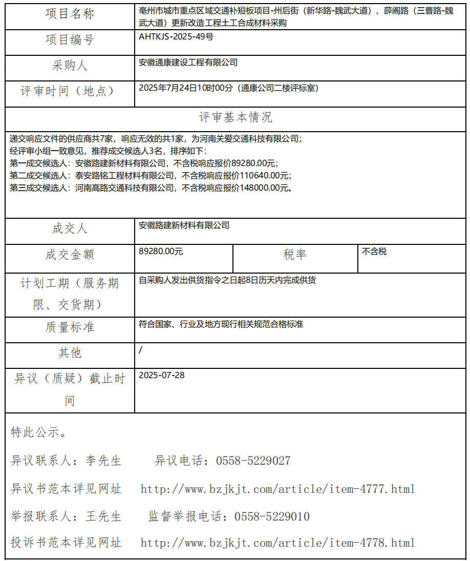 亳州市城市重點(diǎn)區(qū)域交通補(bǔ)短板項(xiàng)目-州后街(新華路-魏武大道)、薛閣路(三曹路-魏 武大道)更新改造工程土工合成材料采購成交結(jié)果公示