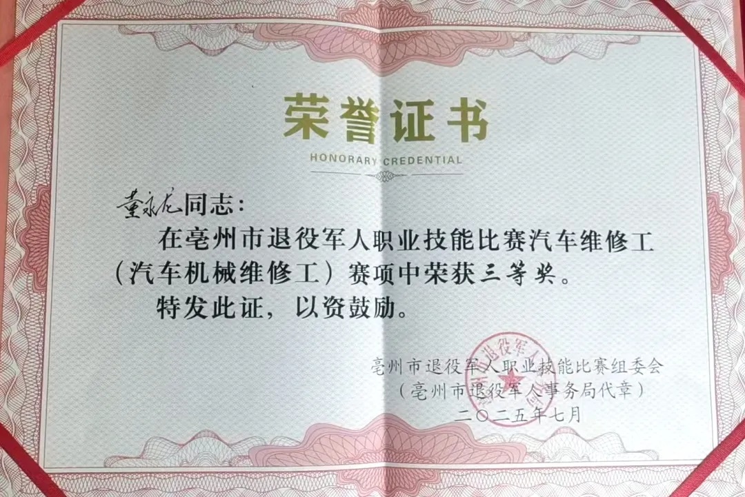 近日,安行天下駕校董永龍同志憑借扎實的專業(yè)知識、精湛的實操技能和穩(wěn)定的心理素質(zhì),在安徽省第三屆退役軍人職業(yè)技能大賽亳州市選拔賽“汽車維修工”賽項中脫穎而出,榮獲三等獎。