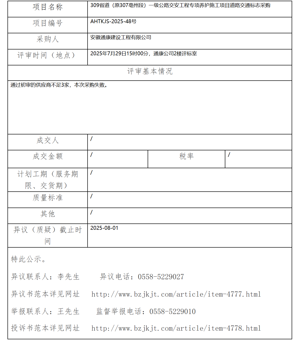 309 省道(原307亳州段)一級公路交安工程專項養(yǎng) 護施工項目道路交通標志采購成交結(jié)果公示
