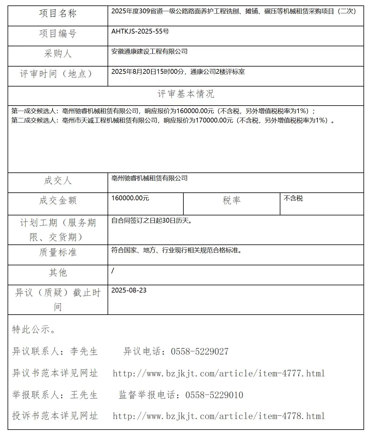 2025年度309省道一級(jí)公路路面養(yǎng)護(hù)工程銑刨、攤鋪、碾壓等機(jī)械租賃采購(gòu)項(xiàng)目(二次)成交結(jié)果公示