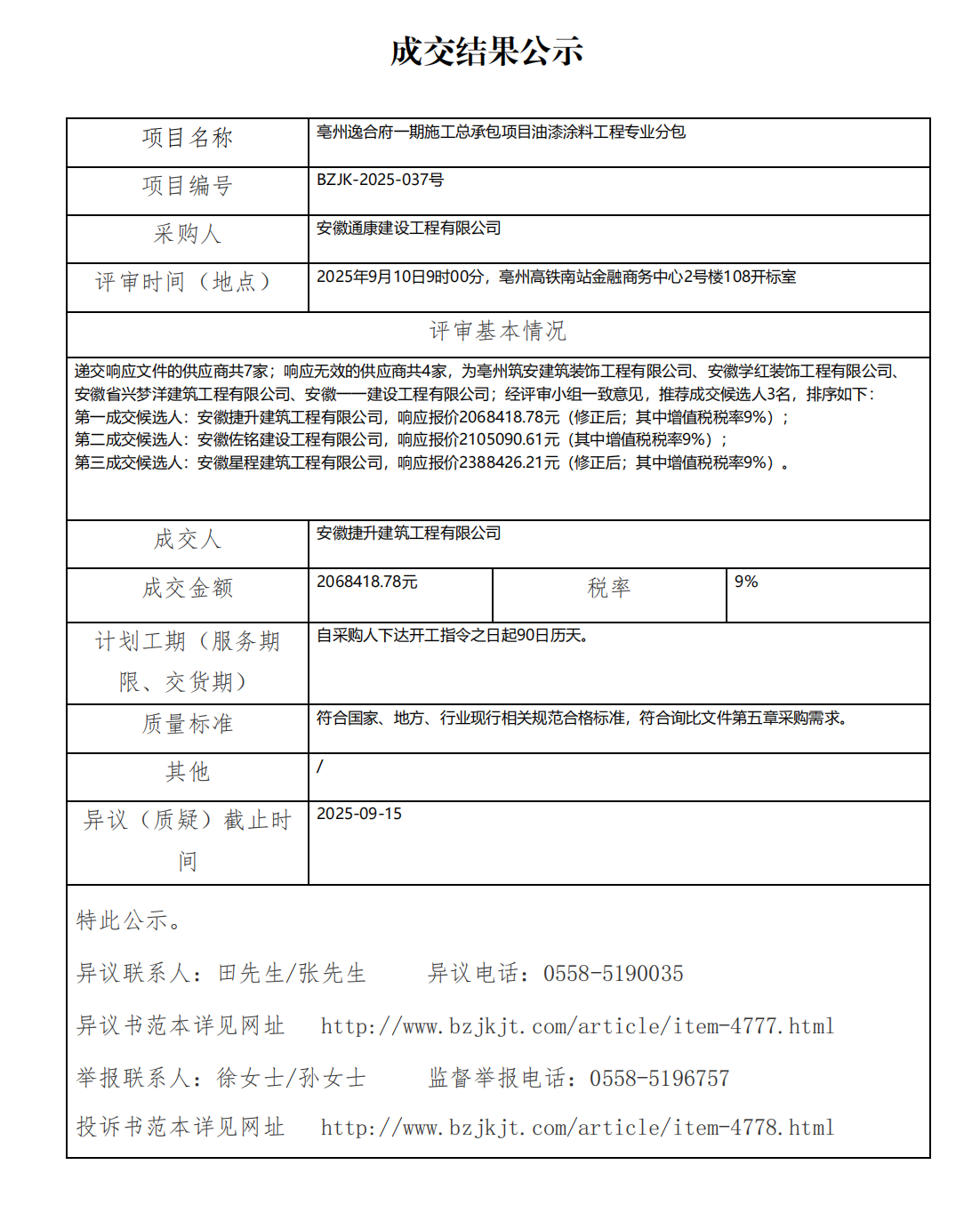 亳州逸合府一期施工總承包項目油漆涂料工程專業(yè)分包成交結(jié)果公示