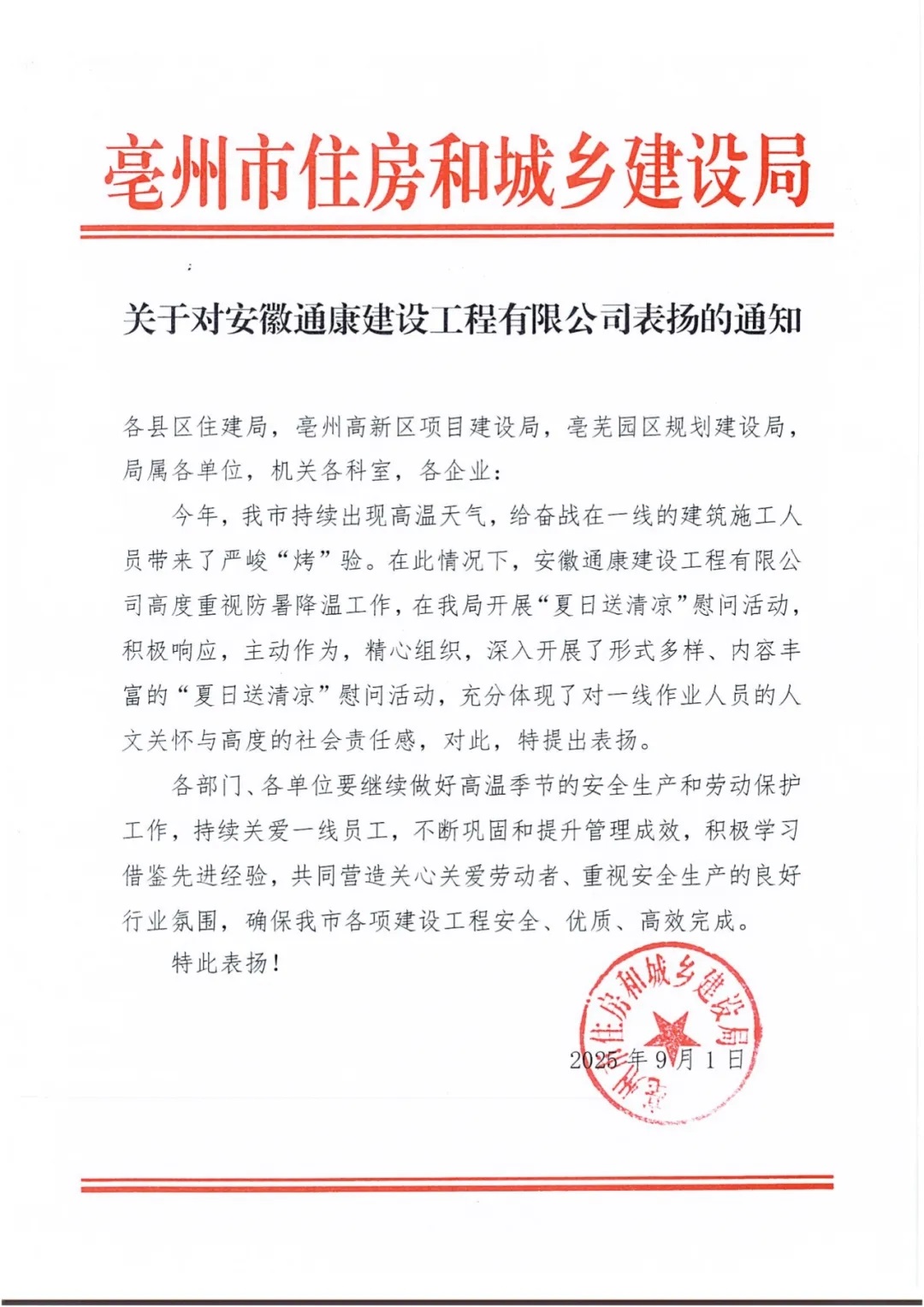 近日,通康公司收到了亳州市住房和城鄉(xiāng)建設(shè)局發(fā)來的表揚(yáng)文件,文件對通康公司在防暑降溫、安全生產(chǎn)、保障勞動者安全健康等方面表示了充分肯定,為全市建筑行業(yè)樹立了優(yōu)秀典范。