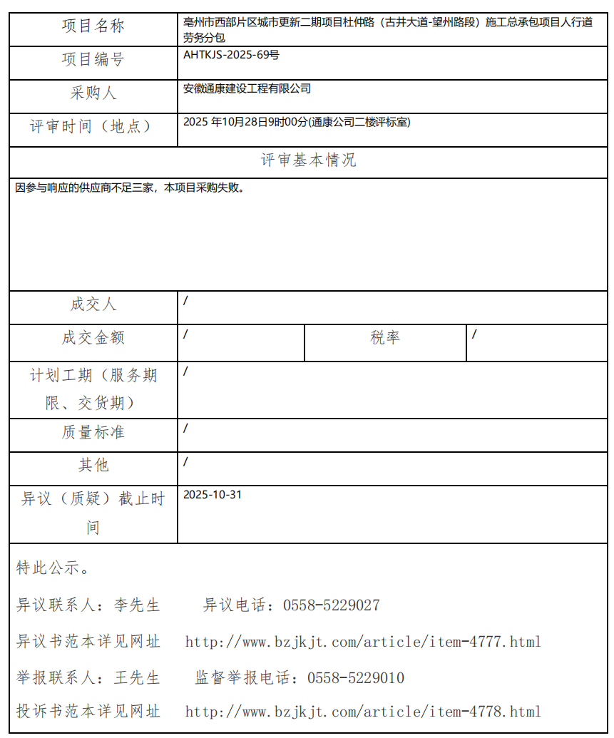 亳州市西部片區(qū)城市更新二期項目杜仲路(古井大道-望州路段)施工總承包項目人行道勞務分包成交結果公示