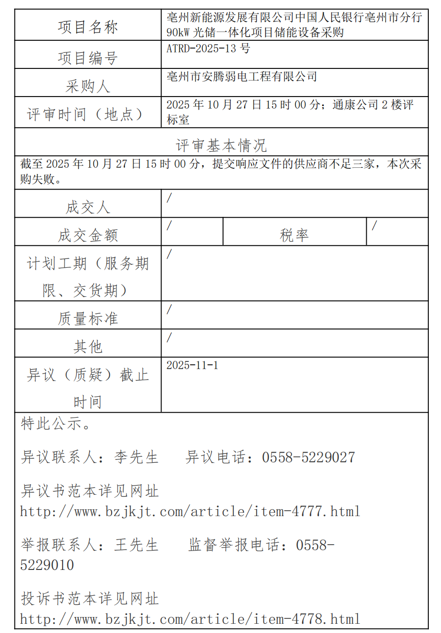 亳州新能源發(fā)展有限公司中國人民銀行亳州市分行90kw光儲一體化項目儲能設備采購成交結果公示