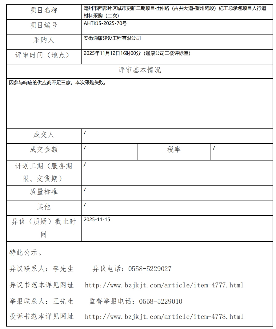亳州市西部片區(qū)城市更新二期項目杜仲路(古井大道-望州路段)施工總承包項目人行道 材料采購(二次)成交結(jié)果公示