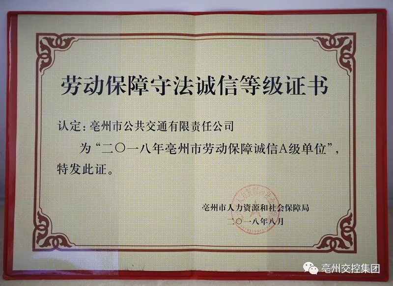 11月28日,市人社局召開亳州市2018年度勞動保障書面審查及誠信評價表彰會,公交公司被授予“亳州市勞動保障守法誠信A級單位”榮譽(yù)稱號。